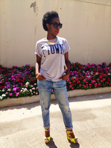 This outfit is inspired by men's clothing. I'm wearing a basic graphic t-shirt with boyfriend jeans. I decided to roll up the sleeves to emphasize the masculine look. But to girl it up, I added floral wedges + statement jewelry pieces + sunglasses & the faithful red lip!
